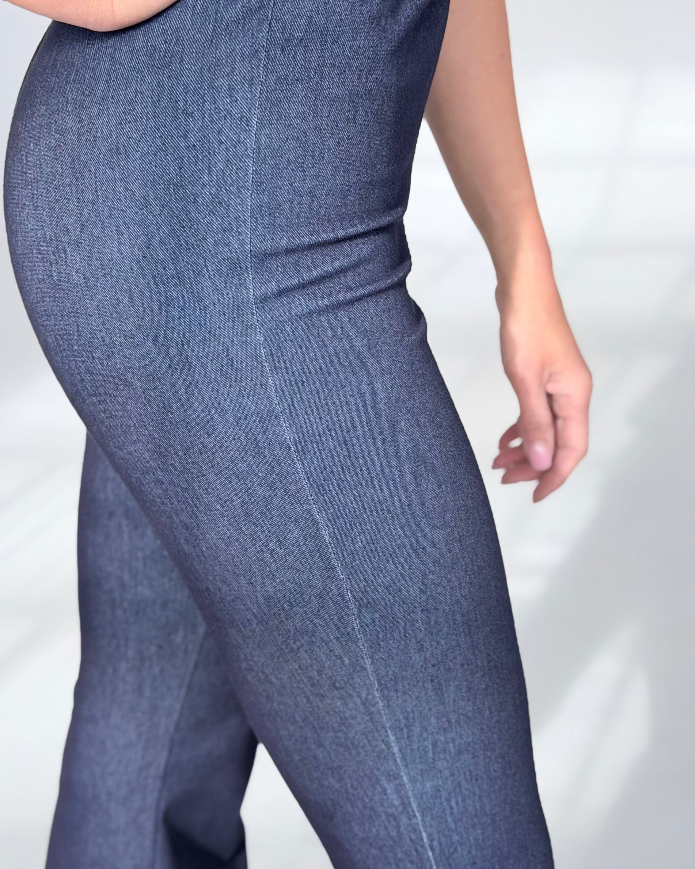 Model uszyty z elastycznej dzianiny o wyglądzie denimu. Materiał dopasowuje się do ciała, nie uciska i nie traci formy podczas noszenia. Wysoki stan stabilnie trzyma talię i zapewnia komfort przez cały dzień.